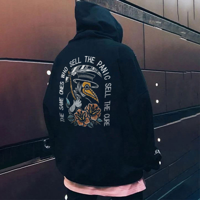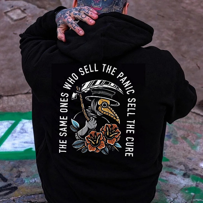THE SAME ONES WHO SELL THE PANIC SELL THE CURE Graphic Black Print Hoodie