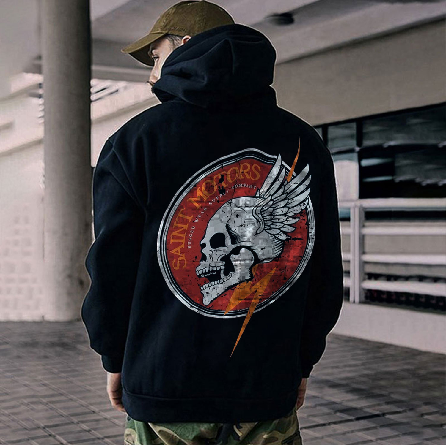 SAINT MOTORS Roaring Skull with Wings Lightning Graphic Black Print Hoodie