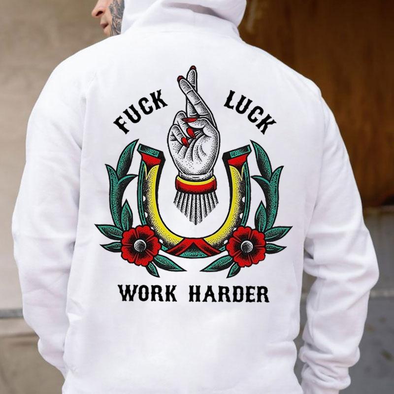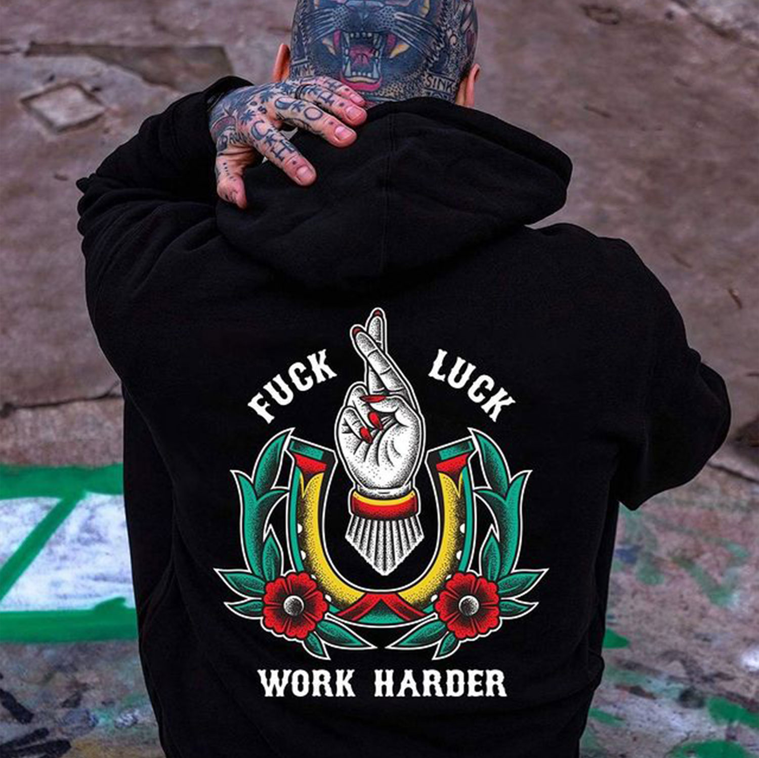 FUCK LUCK WORK HARDER Hand Flowers Graphic Black Print Hoodie