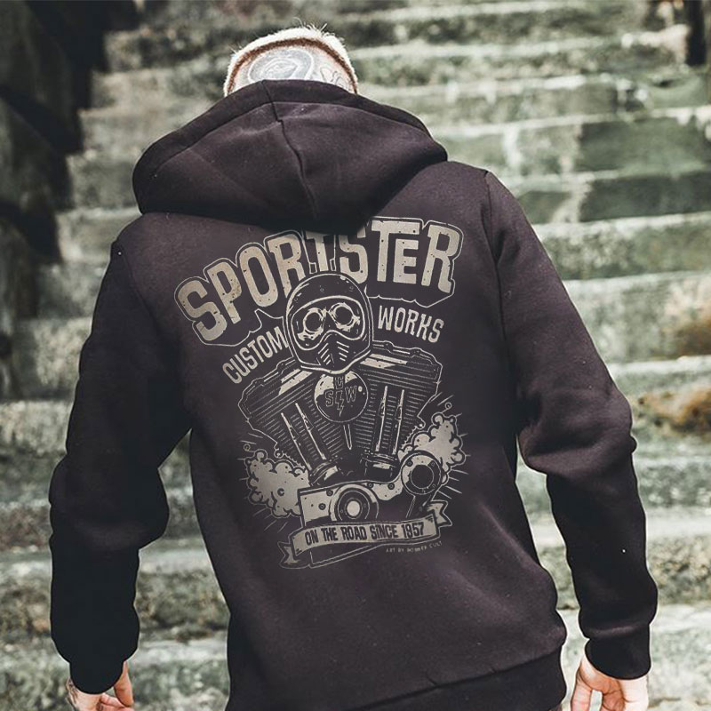 SPORTSTER CUSTOM WORKS Skull with Helmet Casual Black Print Hoodie