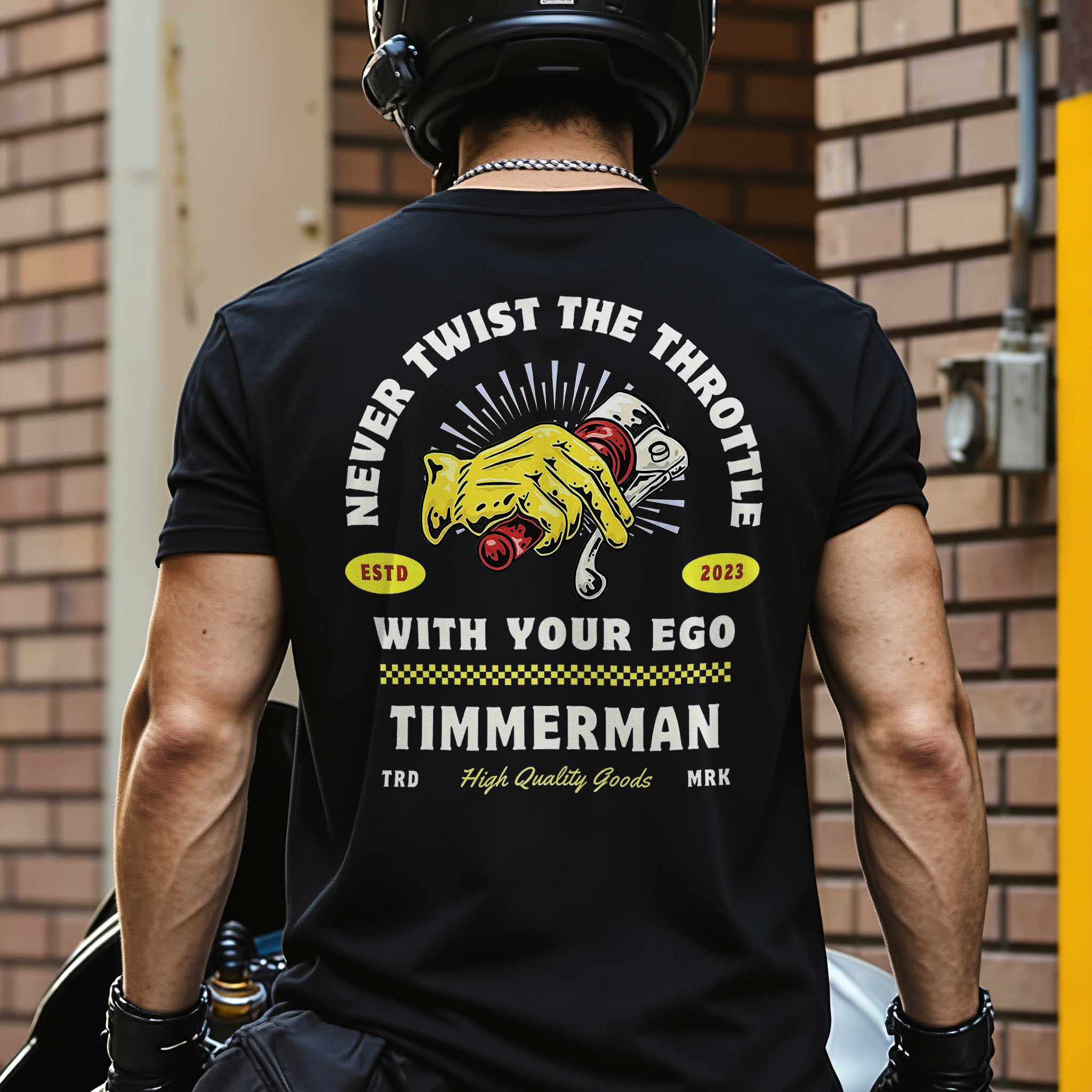 Never Twist The Throttle With Your Ego. Timmerman. Estd 2023. Trd High Quality Goods Mrk Printed Men's T-shirt