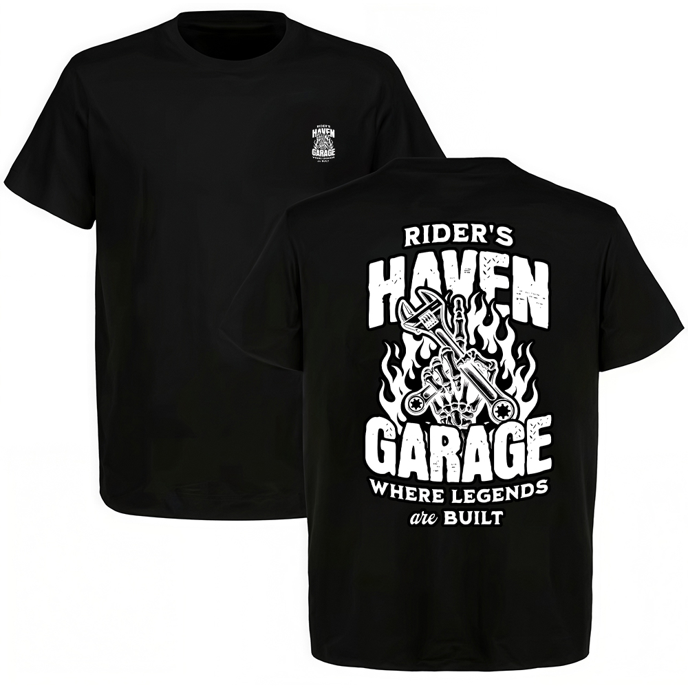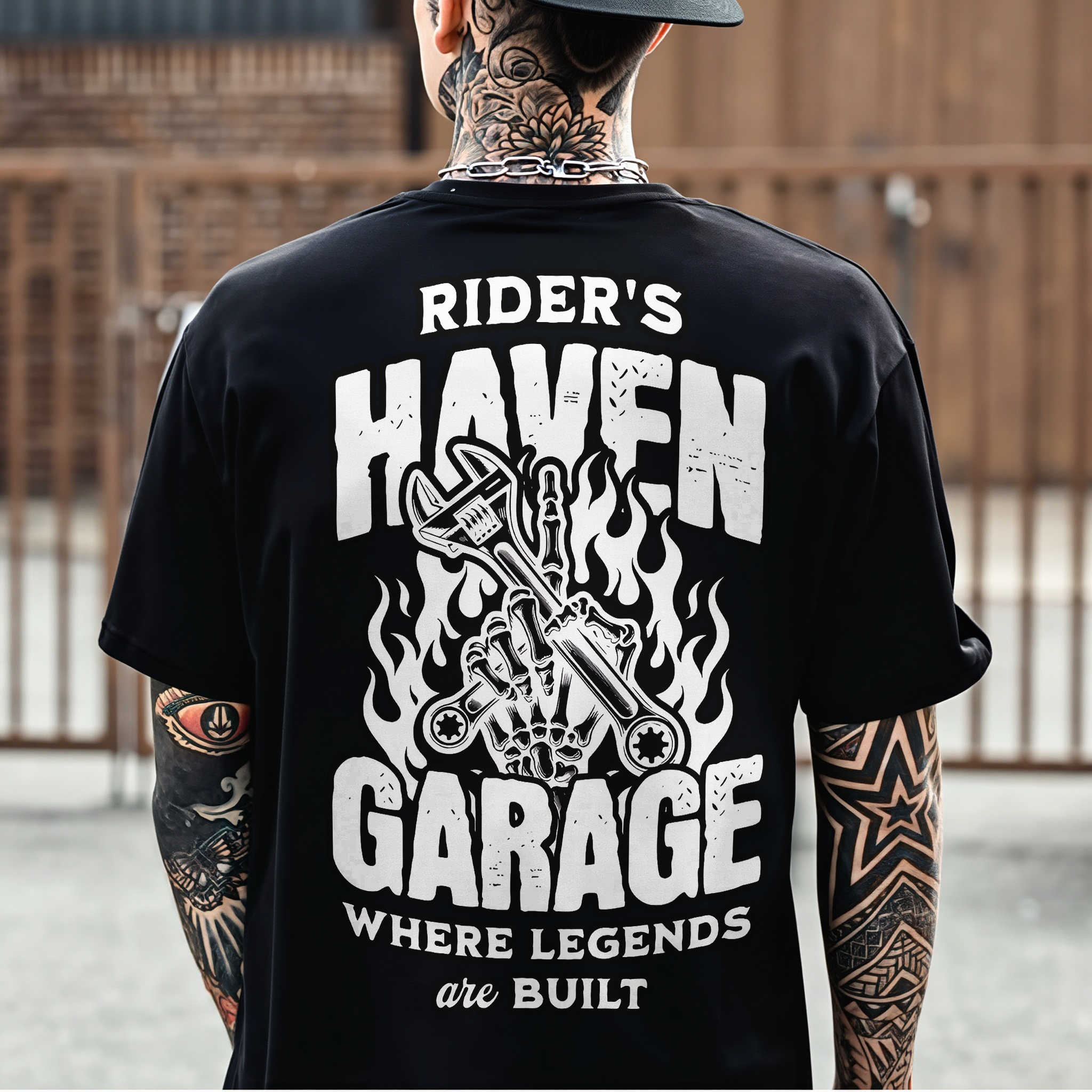 Rider's Haven Garage Where Legends Are Built Printed Men's T-shirt