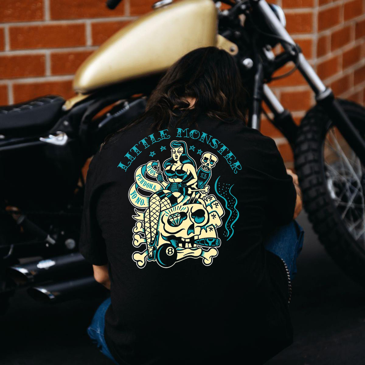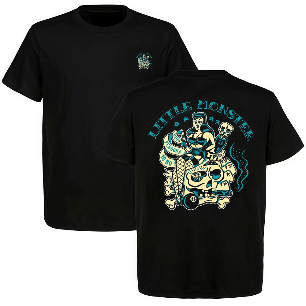 Little Monster Retro Pin-up On Skull With Dice And 8-ball Art Printed Women's T-shirt