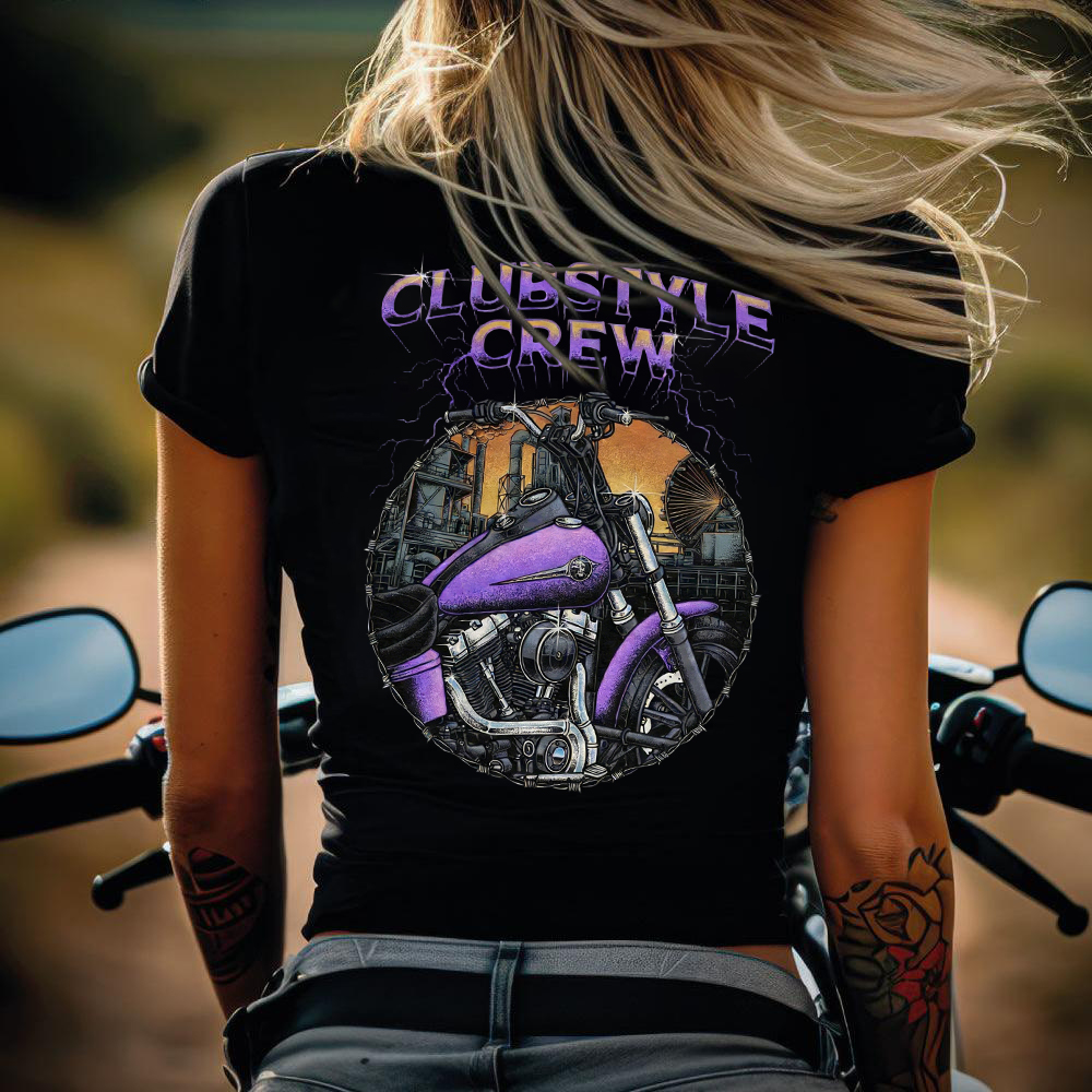 Clubstyle Crew Purple Motorcycle Engine Industrial Background Graphic Printed Women's T-shirt