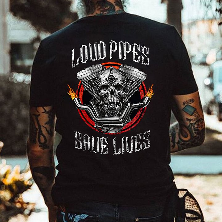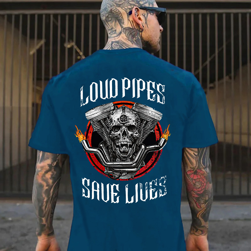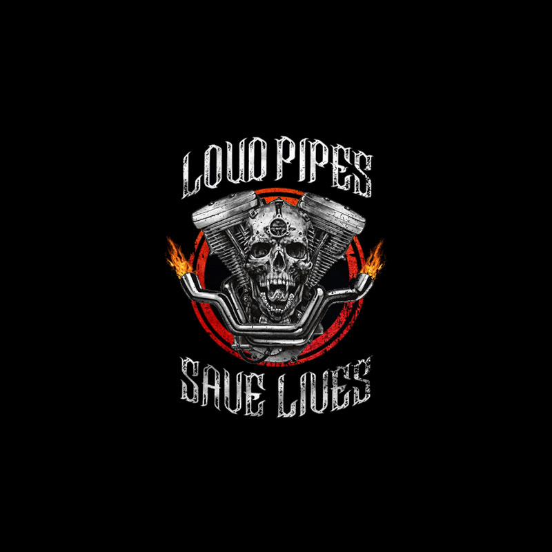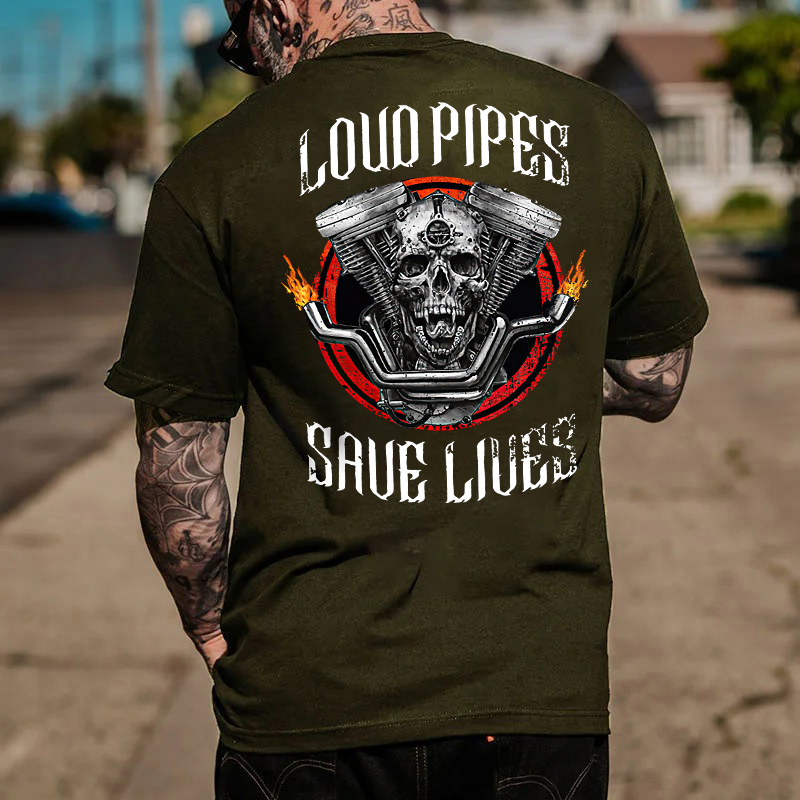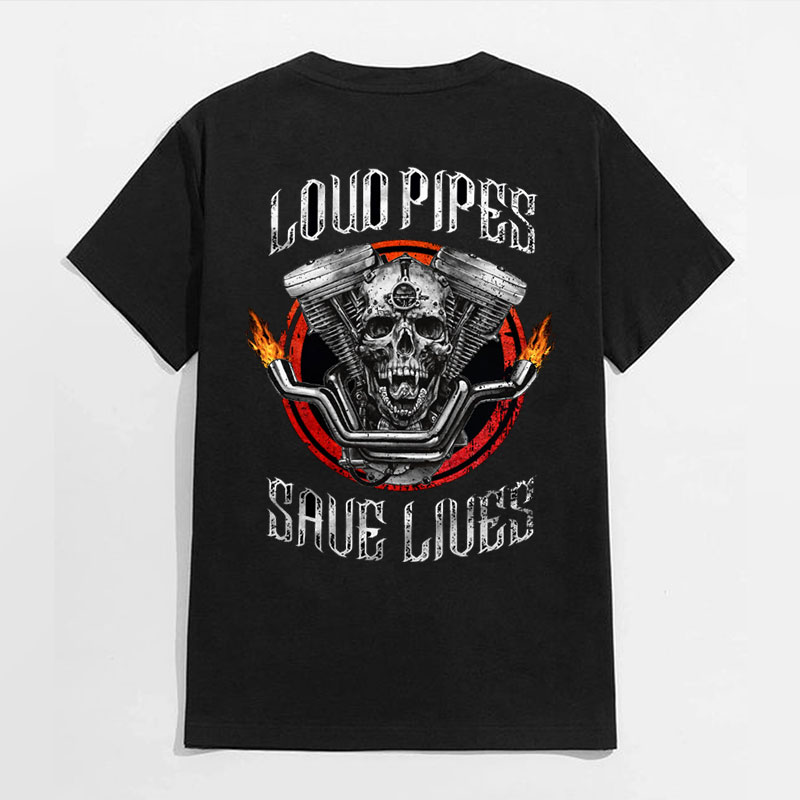 LOUD PIPES SAVE LIVES Skull Motor Black Print T-Shirt