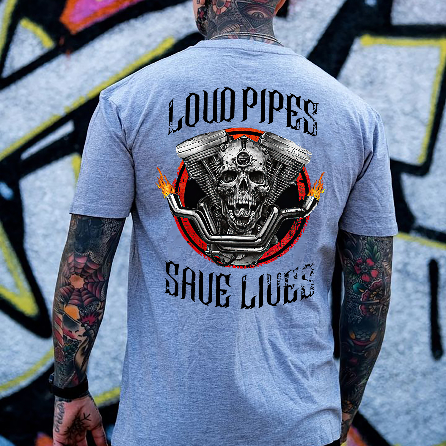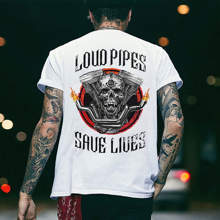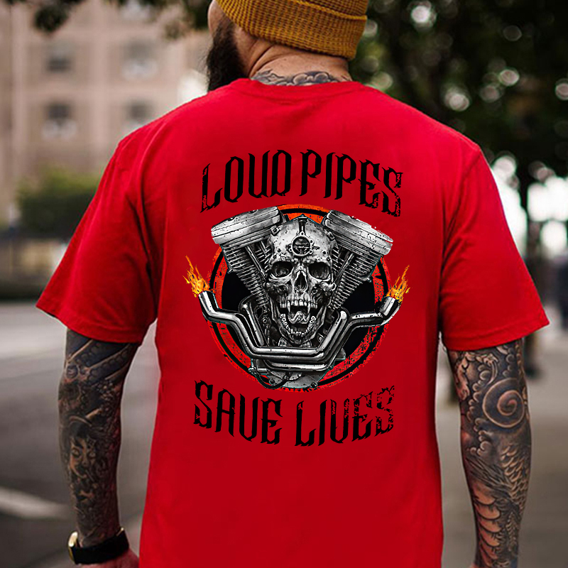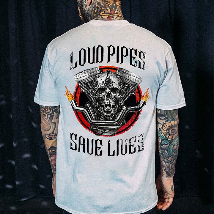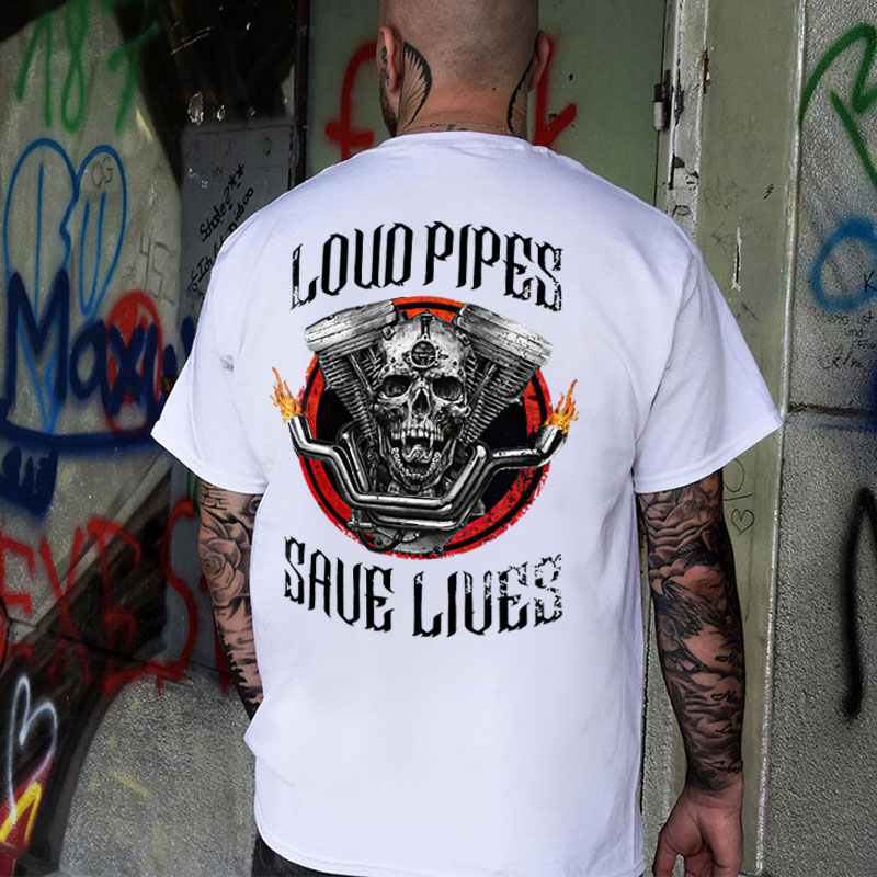LOUD PIPES SAVE LIVES Skull Motor Black Print T-Shirt