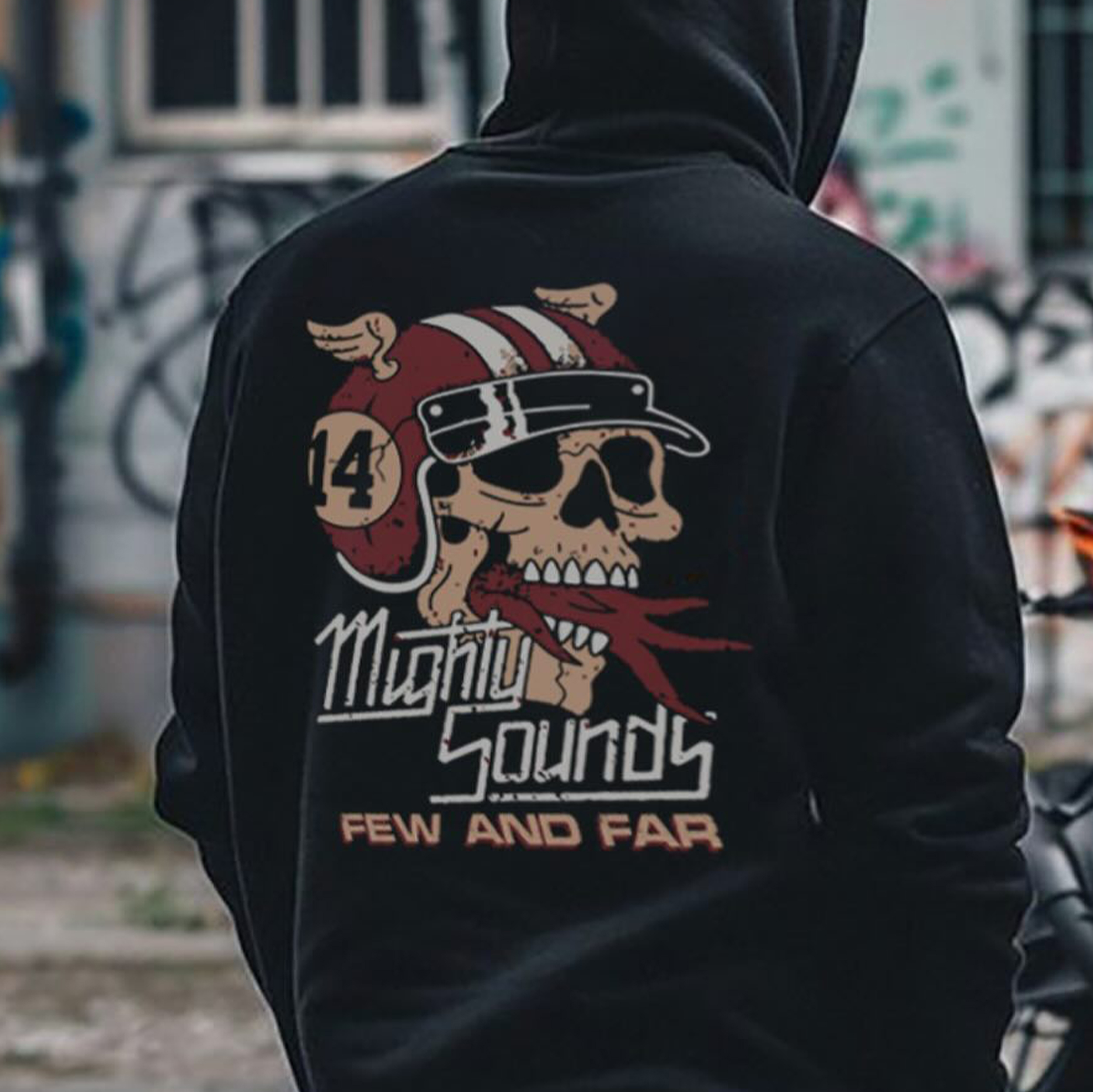 MIGHTY SOUNDS FEW AND FAR Helmet Skull Print Men's Hoodie