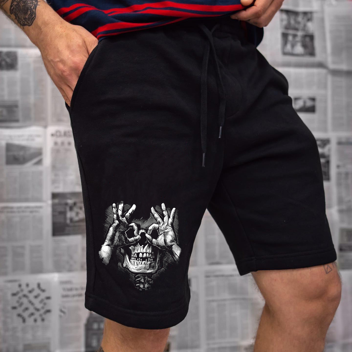 Skull with OK Gesture Vintage Black Print Shorts