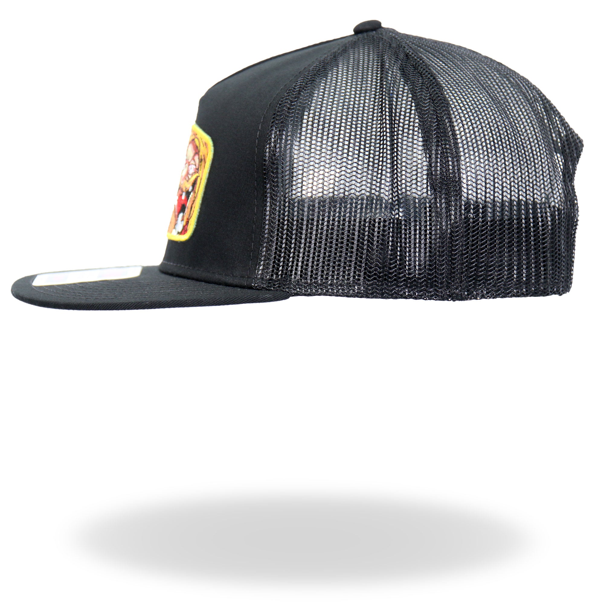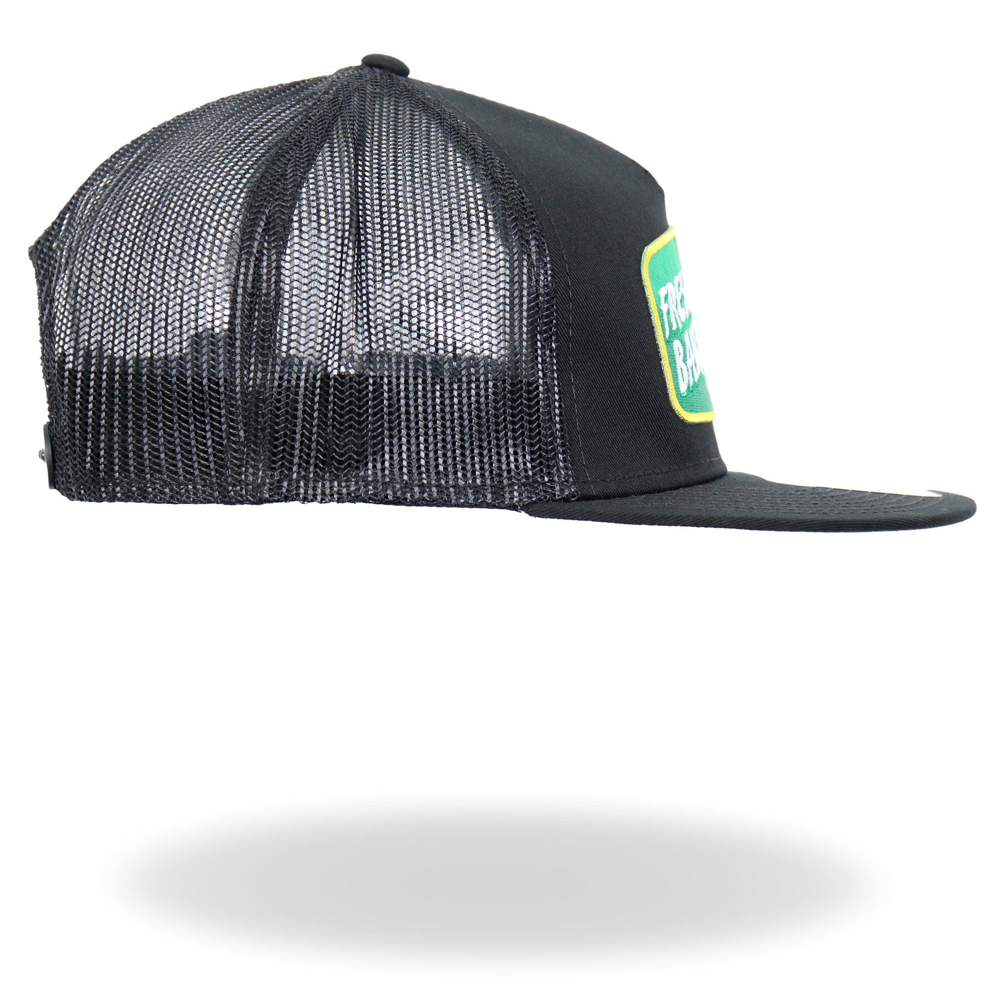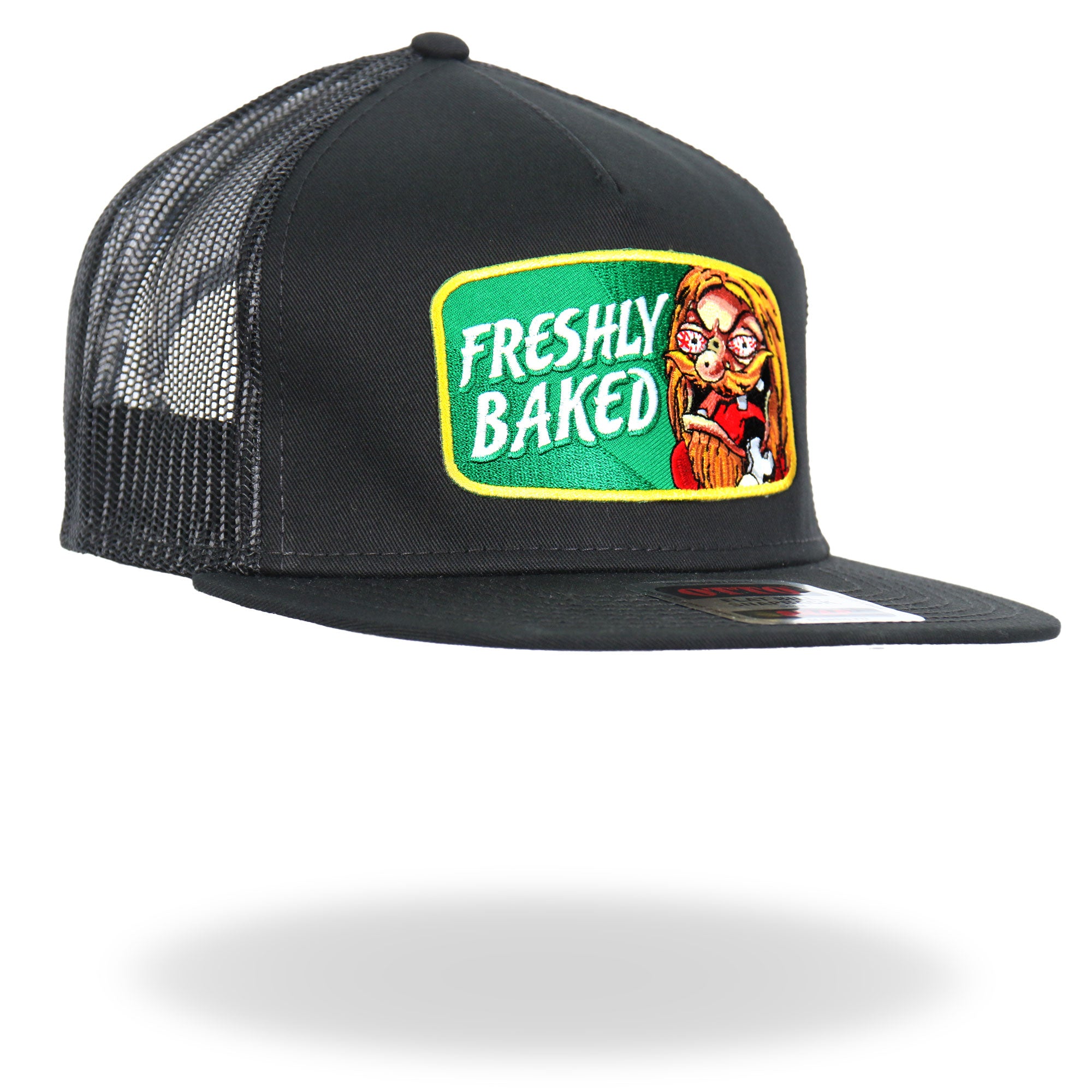 This black freshly baked hat features a green and yellow bordered patch with a stoner mechanic holding a wrench.